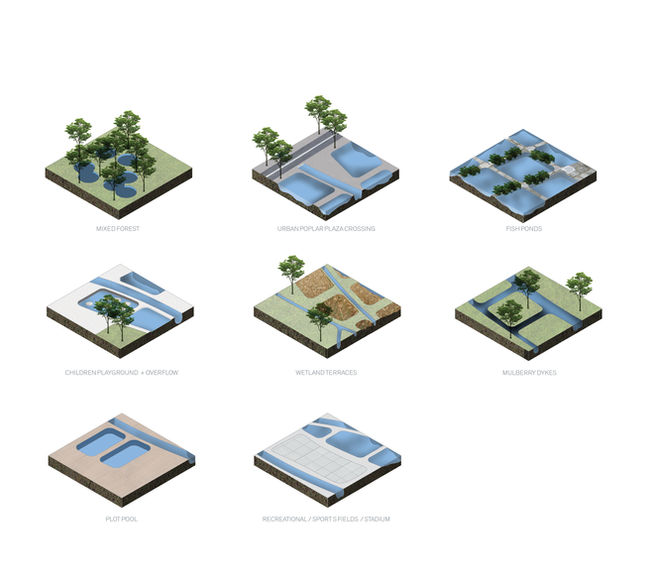 Beginning with an extension of the wetlands, a braided system of canals will feed a landscape of mulberry dykes and fish ponds. Flowing south, the braided canals will coalesce to form a primary channel that will carry water throughout the axis, feeding a familial system of productive ponds, ornamental pools, and on to a system of terraced wetlands, that will clean the water before it enters a natural swimming pool at the Waterfront. Divided into three sections, the productive landscape will become the primary organizer of the site, over which complimentary circulation and program is embedded.